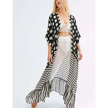 Show moreIntroducing the Eddoyee Stripe Print Beach Long Kimono Cardigans for Women—your new favorite swimwear accessory! Perfectly blending style and function, this elegant kimono cover-up features a chic black and white stripe print design that elevates any beach look. Made from high-quality, lightweight fabric, it drapes beautifully over your swimwear, offering the ideal balance between comfort and sophistication. Whether you're lounging by the pool, strolling on the beach, or heading to brunch, the half sleeve open front design caters to every occasion, making it an essential addition to your summer wardrobe.