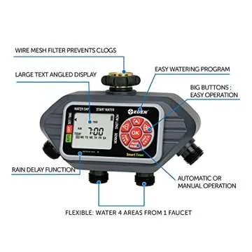 Show moreIntroducing the remarkable Eden 4-Zone Digital Water Timer, an innovative device designed to transform your watering routine effortlessly. This timer operates four separate valves, allowing you to manage irrigation for multiple areas from a single faucet. Whether you're maintaining a lush garden, landscaping, or simply ensuring your plants receive the optimal amount of water, this product stands out for its flexibility and ease of use. With a large, angled LCD display and easy-to-press buttons, programming is comfortable and intuitive, making it accessible for gardeners of all levels.