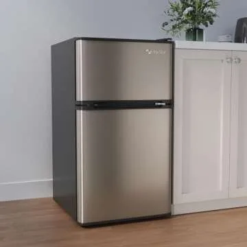 Show moreThe EdgeStar CRF321SS 3.1 Cu. Ft. Dorm Sized Energy Star Compact Fridge/Freezer offers a perfect blend of functionality and style, making it an ideal choice for students, small apartments, or offices. Featuring a true zero degree freezer that ensures your ice cream stays frozen, this compact appliance does not compromise on storage capabilities. Its reversible doors allow for flexible space utilization, while the thoughtfully designed door bins in both refrigerator and freezer sections provide additional organization options. The sleek design, featuring durable stainless steel doors paired with black cabinets, adds a touch of modern aesthetics that fits effortlessly into any environment.