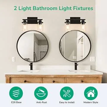 Show more This stunning 2-light bathroom vanity light brings a touch of modern elegance to your bathroom or vanity area. Designed with a sophisticated matte black finish combined with sheer glass shades, this fixture suits a range of decoration styles from minimalist to rustic. It's not just about looks; the high-quality metal frame is durable, anti-oxidation, and designed to last, even in humid environments. The clear glass shades not only protect the sockets from dust and moisture but also provide bright and even illumination to enhance the space around mirrors.