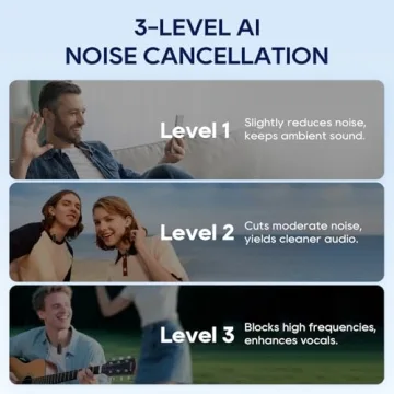 - 3-Level AI Noise Cancellation: Tailor your recording experience with 3 distinct noise cancellation modes, intelligently designed to block unwanted sounds while preserving the warmth of your vocals.