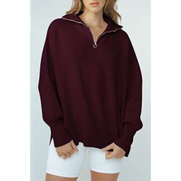 Show moreIndulge in ultimate comfort and stylish versatility with the EFAN Women's Quarter Zip Pullover. This 2023 Fall oversized long sleeve pullover combines functionality and fashion seamlessly. Crafted with care, its cozy knit fabric feels soft against the skin, making it an essential addition to your autumn wardrobe. The eye-catching wine red hue adds a rich, sophisticated touch, ensuring you stand out in any crowd. The unique 1/4 zipper collar not only enhances its trendy design but also allows for effortless layering, making this pullover perfect for chilly days and transitional weather.