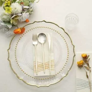 Elevate your dining experience with the Efavormart 10 Pack | 10" Clear/Gold Beaded Rim Plastic Dinner Plates, where sophistication meets convenience. These exquisite disposable plates feature a luxurious Baroque design with a beaded accent, perfect for adding a touch of elegance to any table setting. With a generous total diameter of 10.5 inches and a depth of 0.5 inches, these plates are not only visually stunning but also functional, providing ample space for your culinary...