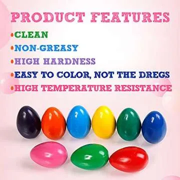 Show moreIntroducing the Egg Crayons for Toddlers – a delightful set of **9 vibrant, washable solid egg-shaped crayons** specially designed for little hands! With a compact size reminiscent of tiny eggs, these ergonomic crayons fit snugly in toddlers' palms, making it easier for them to grip and create. Crafted from **non-toxic materials** including resin, food-grade paraffin, and safe pigments, these crayons ensure the utmost safety for your little ones while they unleash their artistic flair. The Egg Crayons not only encourage imaginative play but also promote cognitive development in your child through the exploration of colors.
