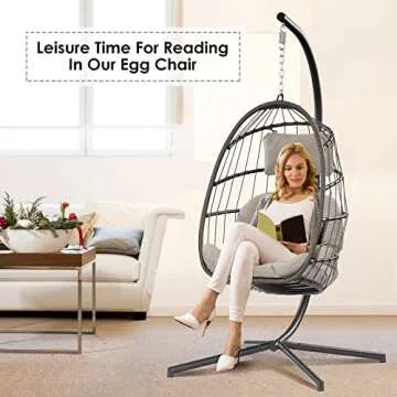 Show more Discover the ultimate relaxation experience with our exquisitely crafted Hanging Egg Chair, designed to elevate your comfort and style! Featuring a robust aluminum steel frame and wrapped in all-weather PE rattan, this chair not only promises supreme durability but is also resistant to rust, ensuring it maintains its elegant appearance for years to come. Experience unparalleled softness with our plush polyester seat cushion and headrest, providing you with a haven for leisure and relaxation as you settle down with your favorite book.