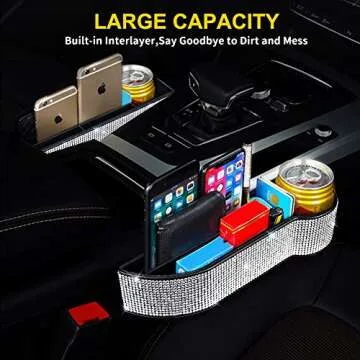 eing Car Seat Side Drop Organizer,Side Slit Car Seat Gap Filler,Car Seat Console Storage Organizer,Bling Seat Pockets with Cup Holder and 2 Charging Port,2PC/1Pair (Clear/Pure White Diamonds)