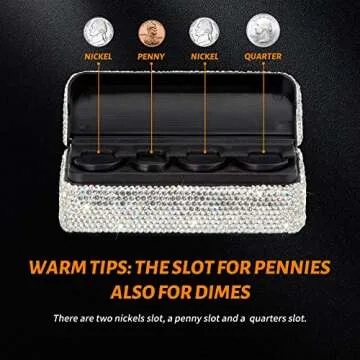 Show moreIntroducing the dazzling Coin Holder for Car, a perfect blend of functionality and charm! This elegant All-in-One Bling Crystal Coin Change Organizer is crafted thoughtfully to cater to the needs of every coin collector out there. Designed with precision, it features four dedicated slots - two for nickels, one for pennies, and one for quarters. This thoughtful organization means no more searching through your car or home for loose change. Available in a stunning silver color, this coin holder doesn’t just serve a purpose; it enhances your car’s interior décor with sparkling rhinestones that glimmer beautifully in any light. It’s not just an accessory; it’s a statement piece that reflects your unique taste and style!