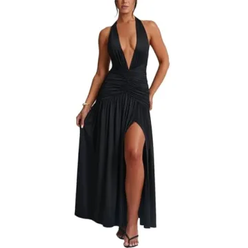 Show more Introducing the Ekaliy Women's Sexy Halter Deep V Neck Maxi Dress – a masterclass in elegance and allure that transforms any occasion into a spectacular showcase of your style. This exquisite dress is crafted from a luxurious blend of 95% polyester and 5% spandex, ensuring a soft, comfortable, and smooth fit that hugs your curves in all the right places, allowing for ease of movement and a true confidence-boosting experience. The striking deep V-neck and high side slit make this piece an eye-catching attraction, perfect for everything from summer parties to sophisticated cocktail events.