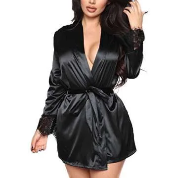 Ekaliy Women's Sexy Lace-Trim Robe Long Sleeve Satin Kimono Sleepwear Bridesmaid Wedding Party Nightwear New Black Small