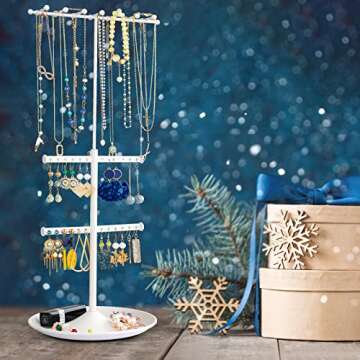 The height adjustable T-bar allows you to customize the display according to the length of your necklaces, making it especially functional for those extra long strands that often get lost in other organizers. This jewelry stand rotates, giving you the option to showcase your favorite pieces from various angles, adding a touch of elegance to your dressing area.
