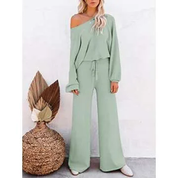 Ekouaer Knit Lounge Sets for Women Pants Sweater Set Crewneck Long Puff Sleeve Pajama Set for Casual Travel Lounge Green Large