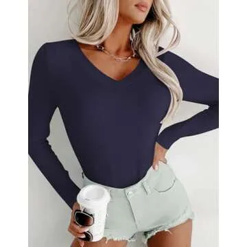 Ekouaer Long Sleeve Shirts for Women Fashion V Neck Basics Tops Lightweight Base Layer Slim Fit Top Navy Blue M