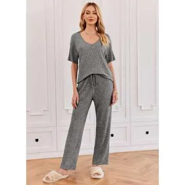 Show more Introducing the Ekouaer Lounge Sets for Women Ribbed Pajama Set, a chic and versatile ensemble that seamlessly combines comfort with style. This two-piece lounge set features a loose ribbed design with a flattering V-neck top and matching long pants, making it the ultimate choice for lounging or sleeping. Crafted from super lightweight and stretchy ribbed fabric, this set is designed to provide all-day comfort while effortlessly elevating your casual look.