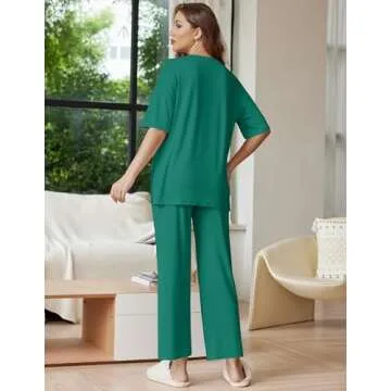 Ekouaer Lounge Sets for Women: Short Sleeve Tops & Long Pants Comfy Pajamas Set in Ivy Green