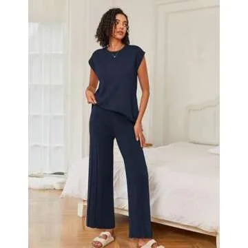 Ekouaer Lounge Sets for Women Two Piece Outfits Knit Cap Sleeve Tops Wide Leg Pleated Pants Casual Dressy Sweater Sets Navy Blue