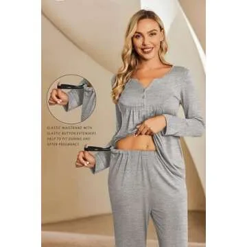 Show more Introducing the ultimate in comfort and functionality, our maternity pajama set is designed specifically for the nurturing mother in mind. Made from 95% rayon and 5% spandex, these pajamas offer a supremely soft and lightweight feel, perfect for all the stages of pregnancy. Whether you are lounging at home or preparing for labor and delivery, our maternity pajamas ensure you stay cozy and stylish through it all.