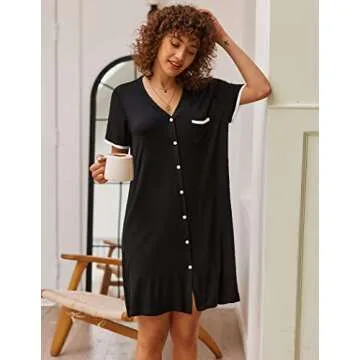 Ekouaer Nightgowns for Women Button Down Pajamas Tops Short Sleeve Sleepwear V-Neck Sleepwear Black M