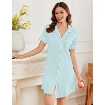 Ekouaer Nightgowns for Women Button Up Night Shirt Short Sleeve Lounge Dress Classic Boyfriend Night Dress Light Blue M