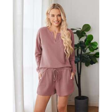 Ekouaer Pajama Set for Women Waffle Knit Lounge Sets Long Sleeve Top and Shorts Matching Loungewear,Rose Red,L