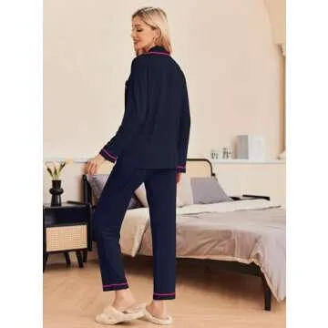 Ekouaer Pajamas Women's Long Sleeve Sleepwear Soft Button Down Loungewear Pjs Lounge Set Nightwear,Navy,Small