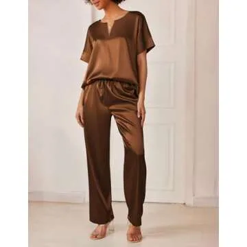 Ekouaer Satin Pajama Set Womens Silk Short Sleeve V Neck Shirt with Long Pant Soft Loungewear Pjs Set Brown