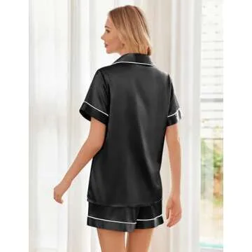 Ekouaer Satin Pajama Sets for Women Silk Pjs Short Sleeve Button Down Sleepwear Top and Shorts Two Piece Lounge Set,Black,S
