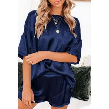 Ekouaer Satin Pajamas for Women Short Sleeve Silk Pajama Sets Soft Sleepwear Top with Causal Pj Shorts Navy Blue