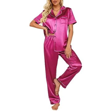 Show moreIndulge in luxurious comfort with the Ekouaer Silk Satin Pajama Set in a stunning rose red hue. Tailored for the modern woman, this sleepwear set brings a perfect blend of style and practicality. Made from a premium fabric composition of 95% Polyester and 5% Spandex, these pajamas offer a soft, buttery feel against your skin, perfect for cozy nights and leisurely lounging. The silk satin finish not only provides a glamorous touch but also enhances breathability, keeping you cool and comfortable during warm nights.