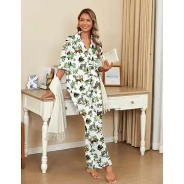Ekouaer Silk Satin Pajamas Set Women Short Sleeve Pj Sets Button Down Sleepwear 2 Piece Soft Loungewear,White Animal,L