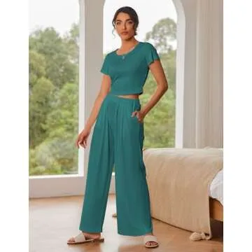 Show moreEmbrace comfort like never before with the Ekouaer Women's 2 Piece Lounge Set, your new go-to for relaxation and style. Crafted from premium elastic ribbed fabric, this stunning set features a soft and breathable material that drapes beautifully against your skin. The flowy design of both the crop top and wide leg pants ensures an effortlessly chic look, whether you're lounging at home or stepping out for errands. With its charming dark teal green hue, this loungewear set adds a pop of color to your wardrobe that is both refreshing and stylish.