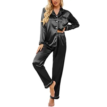 Ekouaer Women's Classic Button Down Long Satin Silk Pajama Set - Black