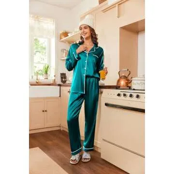 Ekouaer Women's Classic Button Down Long Satin Silk Pajama Set,Medium,Blue Green