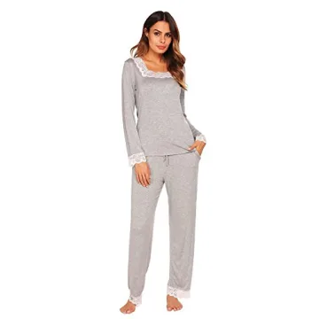 Ekouaer Women's Lace-Trimmed Comfort Pajama Set in Grey
