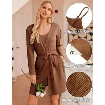 Ekouaer Womens 3 Piece Waffle Knit Lounge Set Soft Pajama Sets Tank Top and Shorts Cardigan with Pockets (Brown, M)