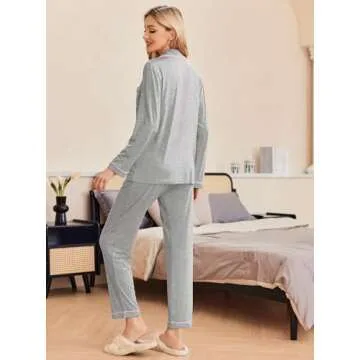 Ekouaer Womens Pajama Sets Long Sleeve Button Down Sleepwear Soft 2 Piece Pjs Lounge Set,Light Grey,M