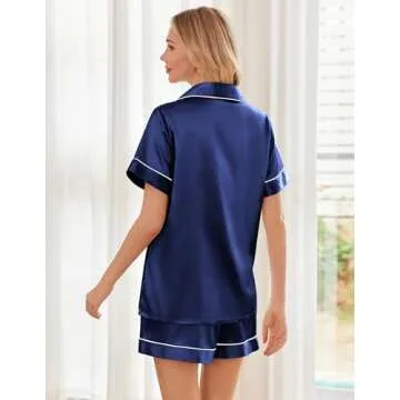 Ekouaer Women's Satin Pajamas Set - Soft Silk Pjs Top and Shorts 2 Piece Lounge Set, Navy, XXL