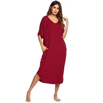 Show moreIntroducing the Ekouaer Women’s Wine Red Nightgown, the epitome of style and comfort that brings a touch of elegance to your nightly routine. Crafted from luxurious, lightweight fabric, this long loungewear sleepwear not only complements your body shape but also envelops you in a total sense of relaxation. With a trendy v-neckline, half sleeves, and a charming button-down design, this nightgown is perfect for all occasions, whether you're enjoying a cozy evening at home or answering the door to guests. The chic knee-length cut ensures a modest yet flattering appearance while providing the freedom of movement that every woman yearns for.