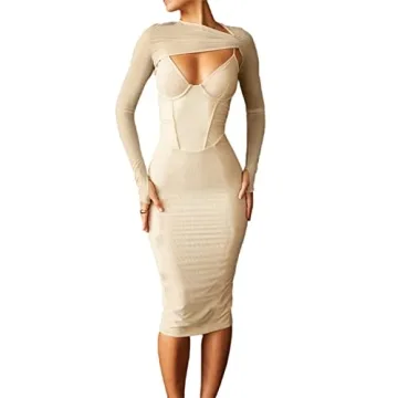 Elainone Sexy Cut Out Front Long Sleeve Pencil Dress for Women Bodycon Keyhole Bandage Party Night Out Midi Dress Clubwear Khaki S