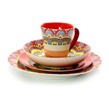 Show moreThe Elama Multicolored Round Stoneware Mandala Pattern Dinnerware Set is a breathtaking 16-piece collection that seamlessly integrates style and functionality, making it the ideal choice for your dining needs. Crafted with a contemporary flair, this dinnerware features exquisite mandala patterns in vibrant red and multicolor accents. Each piece has been designed not just as tableware but as a piece of art that elevates your dining experience. When you set your table with this stunning dinnerware set, you are sure to impress your guests and bring joy to every meal. The dishes are perfectly crafted to provide a full service for four, making them perfect for family dinners, festive gatherings, or intimate celebrations.