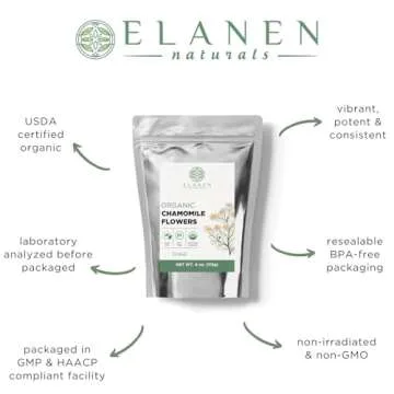 Elanen Naturals Organic Chamomile Flowers 4 oz. (113g), USDA Certified Organic Camomile Manzanilla Tea Loose Leaf, German Chomomile Golden Chamomeal Herb, Whole