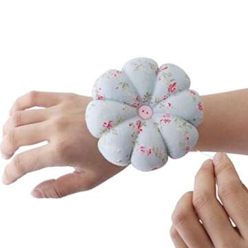Show more Introducing the remarkable Elastic Wrist Belt Pumpkin Pin Cushion, an essential companion for every sewing enthusiast. Designed with a charming blue floral pattern, this pin cushion not only catches the eye but also offers practical functionality for all your needlework needs. Made from 100% cotton fabric, featuring a delightful polka dot print on the exterior and filled with 100% recycled polyester cotton, it beautifully blends aesthetics and eco-friendliness. Its unique design provides a snug yet comfortable fit for larger wrists, making it an ideal accessory for anyone who loves sewing.