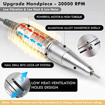 This nail drill features a bit lock-up system that allows for quick and easy replacement of drill bits.