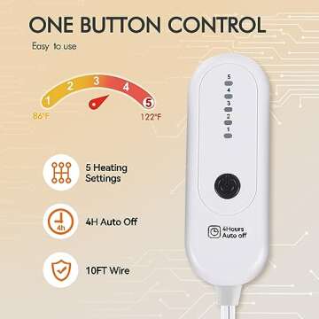 With user-friendliness in mind, our electric throw blanket operates with a simple one-button control that lets you choose from five customizable heating levels ranging from 86°F to 122°F. The blanket doesn't just keep you warm; it also has an efficient auto-off feature that ensures safety, shutting off automatically after 4 to 10 hours, depending on the size.