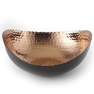 Show moreIntroducing the Elegance Eclipse Bowl, a dazzling 8.25" x 7.5" centerpiece that seamlessly combines striking aesthetics with unparalleled functionality. Crafted from easy-care aluminum, this bowl not only boasts a captivating hammered two-color design in black and copper but is also food safe, making it an ideal choice for serving delicious fruits, nuts, or candies. With its modern elegance, expect it to become a conversation starter at every gathering, enhancing your home decor with a luxurious flair.