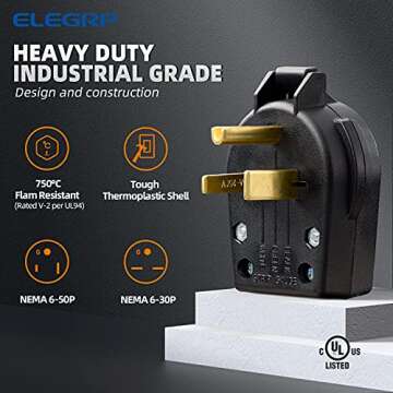 ELEGRP NEMA 6-30P & NEMA 6-50P Plug, Straight Blade Heavy Duty Angle Plug, 30 Amp 50 Amp 250V 3 Prong Power Plug for Welder/Generator, Industrial Grade, Grounding, 2 Pole 3 Wire, UL Listed, 1 Pack