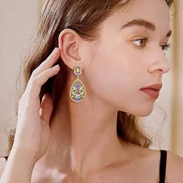 EleQueen Women's Wedding Bridal Austrian Crystal Bohemia Teardrop Chandelier Dangle Earrings Iridescent Clear Gold-Tone