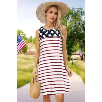 Show moreIntroducing the Elescat America Flag Dresses for Women, the perfect blend of style, comfort, and celebration for your summer gatherings. This casual sleeveless sundress features a vibrant America flag pattern, making it an ideal choice for the July 4th festivities or any summer outing. Designed with the versatility of a summer t-shirt dress, it falls gracefully above the knees, ensuring you stay cool and stylish without the need for leggings. The soft fabric offers a comfortable, flowy feel, perfect for lounging at home or dancing the night away.