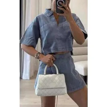 Show more Introducing the chic and trendy Denim Skirts Set, designed for the modern woman who loves to make a statement! This unique outfit combines a stylish lapel v-neck short sleeve pullover denim top with a gorgeous asymmetrical hem jean short culotte. Crafted with attention to detail, the top features a lapel collar, short sleeves, and a deep v-neck that adds a touch of elegance to your casual looks. With two chest pockets and a high-low hem, it's perfect for layering and creates a flattering silhouette.