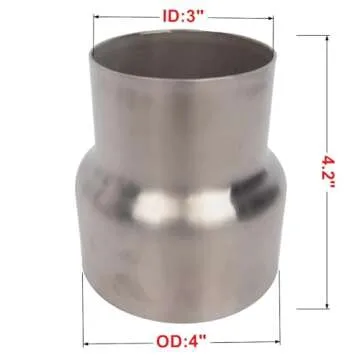 Show moreElevate your vehicle’s exhaust system with the Elifecenter Stainless ID 3" to OD 4" Exhaust Reducer Adapter. Designed precisely to seamlessly connect pipes from a 3-inch inner diameter to a 4-inch outer diameter, this adapter boasts a whole length of 4.2 inches and a robust thickness of 0.054 inches. Crafted from high-grade T201 stainless steel, it not only ensures durability but adds a sleek aesthetic touch with its polished surface. This exhaust reducer is engineered for optimal performance, allowing you to enjoy enhanced sound and efficiency, whether for a practical upgrade or a prominent display.