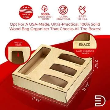 Show moreDiscover the unmatched elegance and functionality of the ELITE DESIGN Ziplock Bag Storage Organizer. This beautifully designed organizer is crafted from high-quality Baltic birch wood, which not only provides durability but also adds a touch of sophistication to your kitchen. With four dedicated slots to comfortably accommodate Gallon, Quart, Sandwich, and Snack bags, it ensures that you have quick access to the right baggie whenever you need it. Whether you're preparing meals, packing snacks, or organizing your pantry, this baggie holder is the perfect companion to streamline your culinary experience.